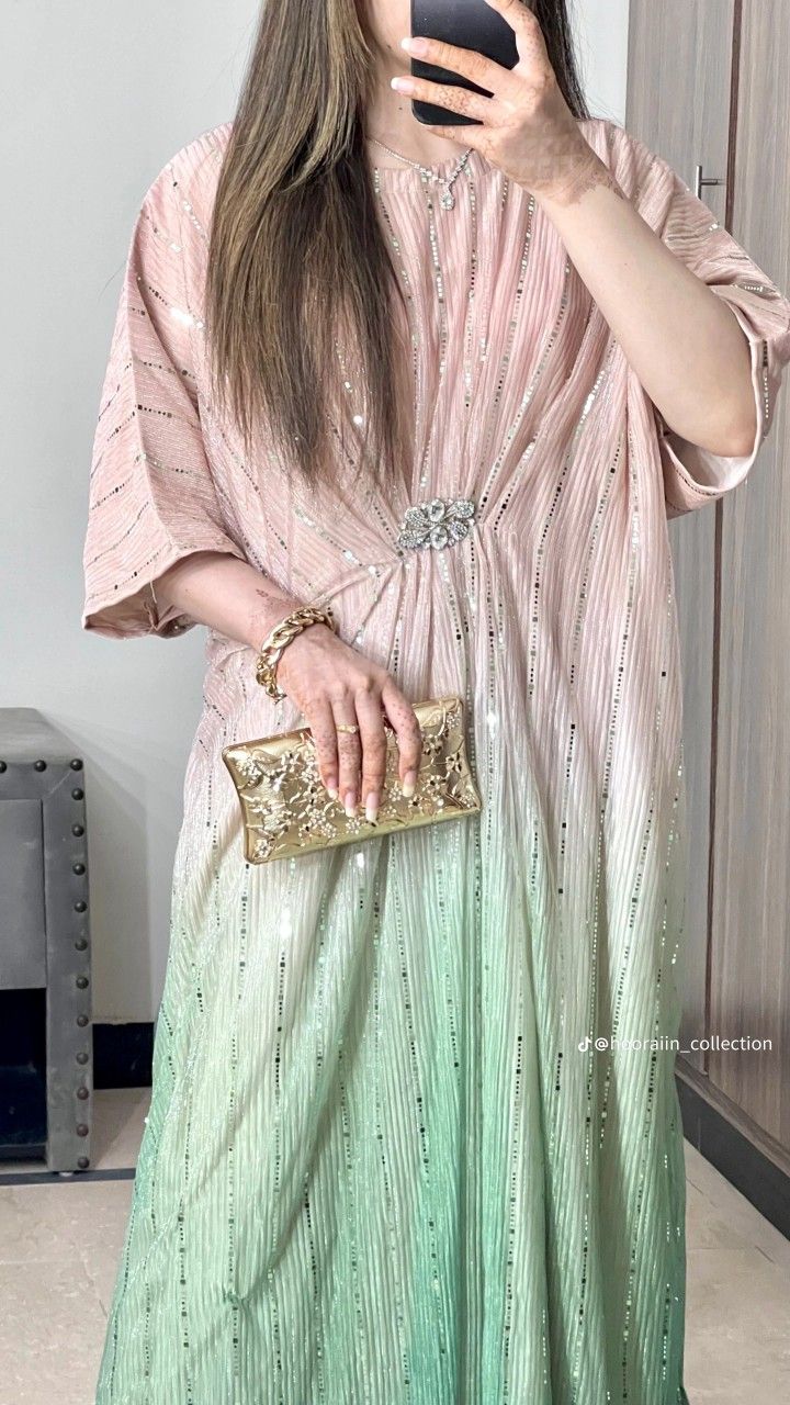 This design features a long kaftan with a waist belt, giving shape to the flowing fabric. The belt can be embroidered or jeweled, making it ideal for parties or evening gatherings where modern style meets tradition.
