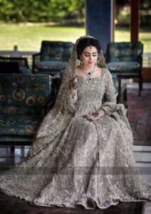 A stunning Walima dress crafted with luxurious fabric and elegant embellishments. It features soft pastel tones, intricate detailing, and a modern silhouette that exudes grace and sophistication—perfect for a dreamy and refined reception look.