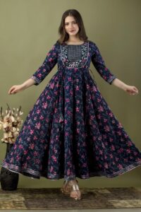 A flowy long frock featuring an intricately embroidered yoke that adds elegance and detail to the neckline, making it a graceful choice for both casual and festive wear.