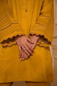 These are straight sleeves with delicate cutwork near the cuffs or edges. The plain fabric balances beautifully with detailed cut patterns, adding elegance.